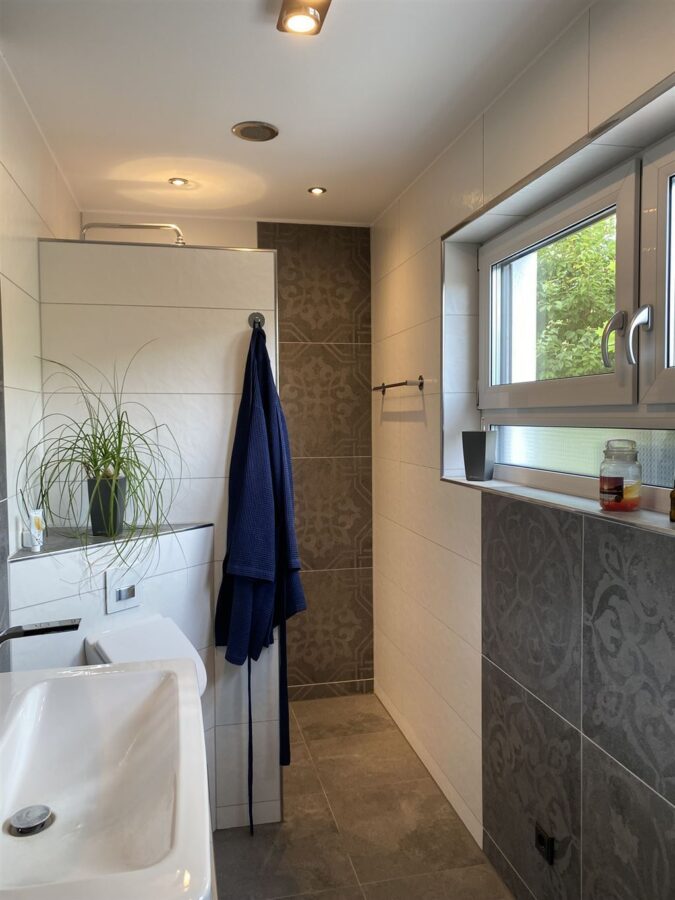 Das Erdgeschoss empfängt mit einem großzügigen, einladenden Eingangsbereich. Direkt anschließend liegt ein überdurchschnittlich großes Gästebad mit Fenster, das mit einem stilvollen Waschtisch und einer vollwertigen Dusche ausgestattet ist.