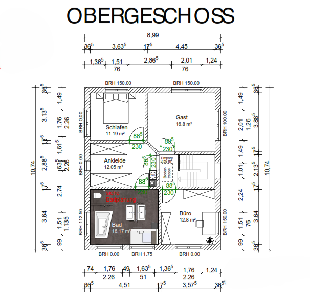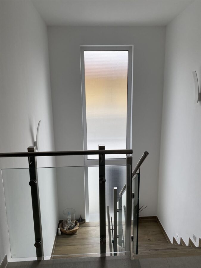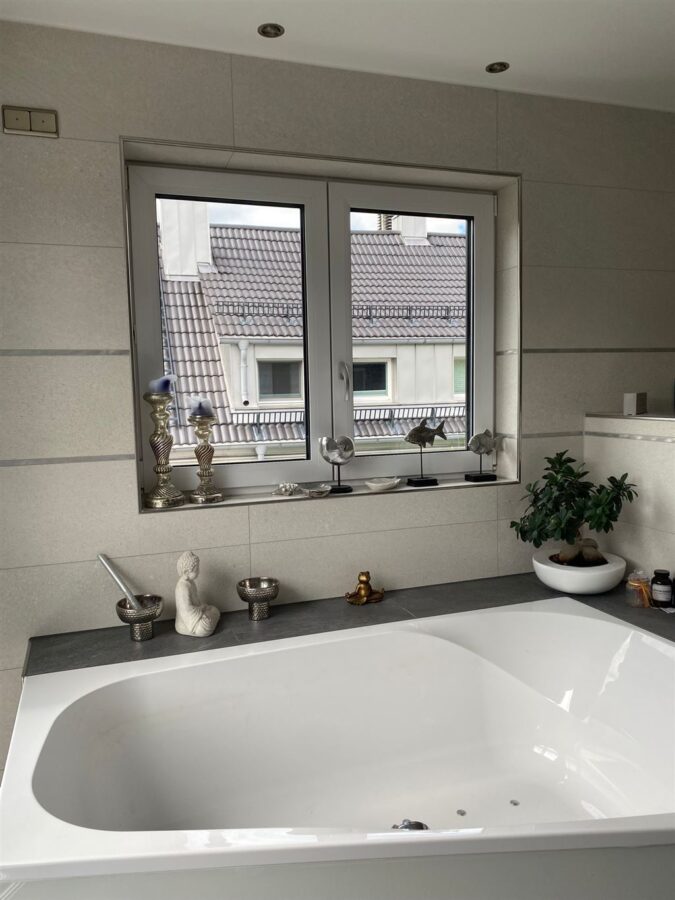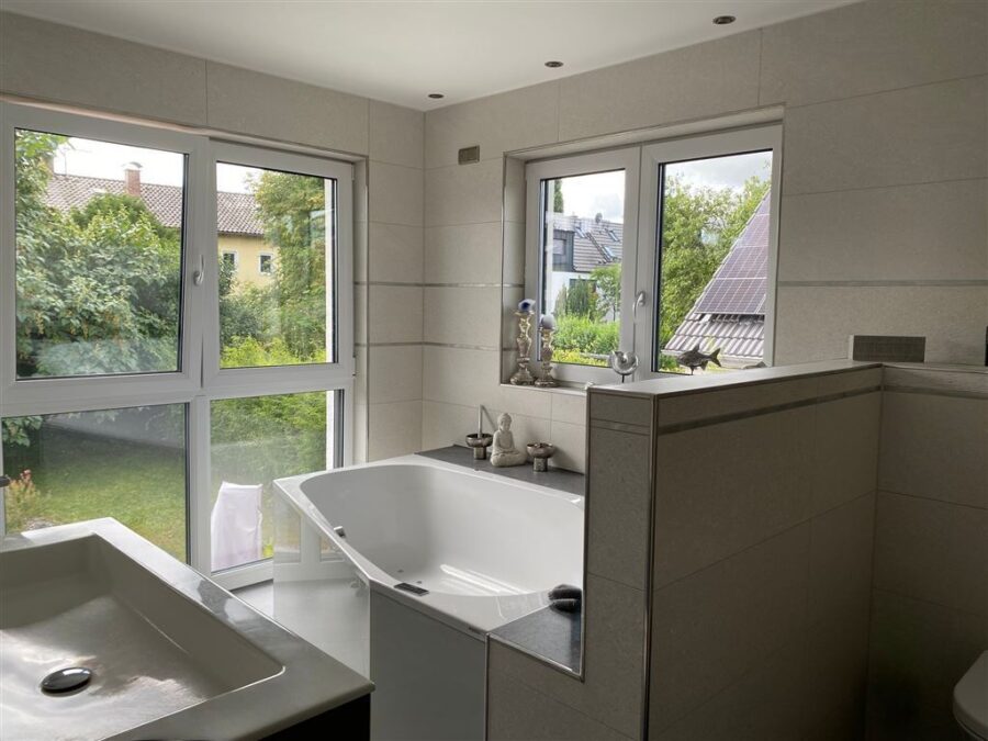 Im Obergeschoss stehen ein Gästezimmer sowie ein separates Büro zur Verfügung. Über die zentral gelegene Ankleide ist sowohl das Schlafzimmer als auch das angrenzende Tageslichtbad erreichbar. Letzteres ist hochwertig ausgestattet mit einer großzügigen Whirlwanne, einer bodengleichen Dusche sowie zwei Waschbecken und entspricht in Gestaltung und Komfort einem modernen Wohnstandard.
