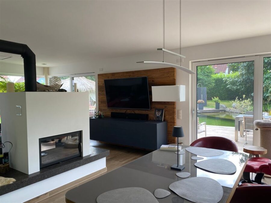 Die offen gestaltete Einbauküche in edlem Weißlack verfügt über eine zentrale Kücheninsel und hochwertige Elektrogeräte. Sie geht fließend in den weitläufigen Wohn- und Essbereich über, der durch einen stilvollen Sichtkamin optisch gegliedert wird. Großflächige Fensterfronten schaffen eine helle, freundliche Atmosphäre und bieten direkten Zugang zur Terrasse und in den Garten.