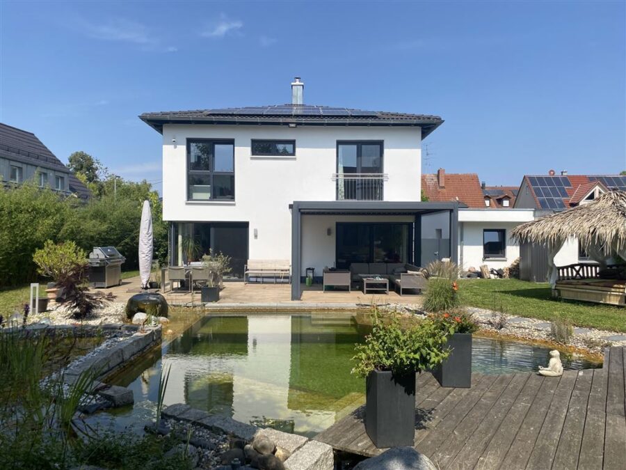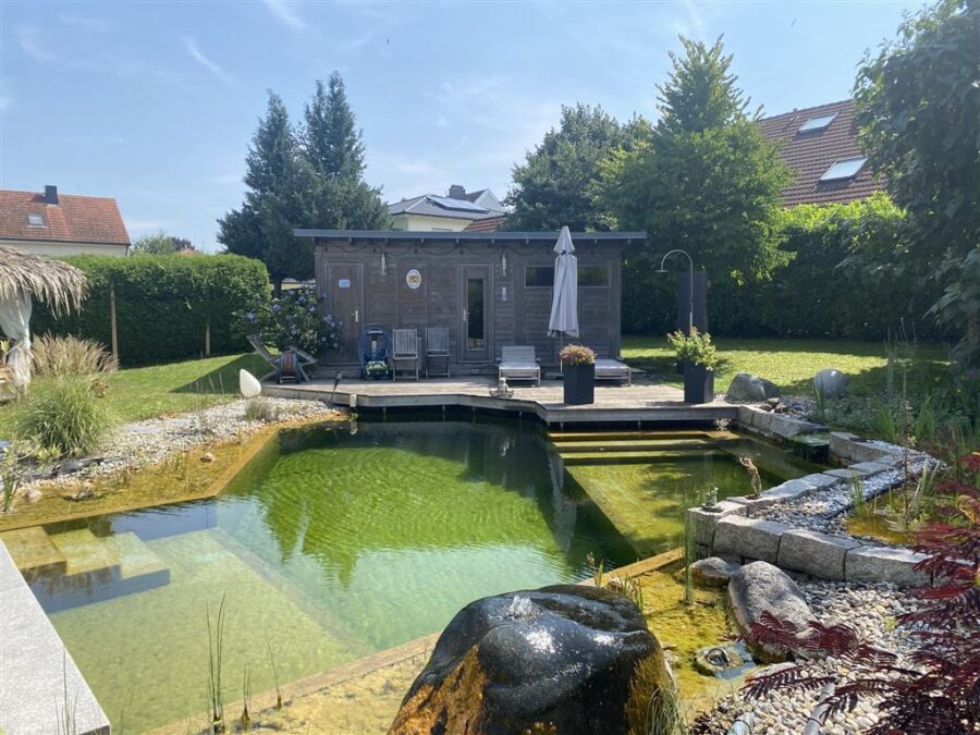 Der liebevoll angelegte Garten ist bereits eingewachsen und bietet durch seine dichte Bepflanzung natürlichen Sichtschutz. Eine große, überdachte Terrasse lädt zum Verweilen ein und eröffnet den Blick auf den privaten Schwimmteich – das Herzstück des Außenbereichs.