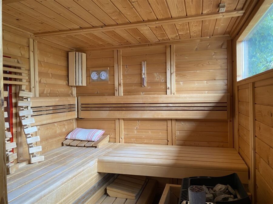 Ergänzt wird das Freiluftangebot durch eine Außensauna mit Ruhebereich, welche ideale Voraussetzungen für entspannte Wellnessstunden schafft. Eine angrenzende Toilette sorgt für zusätzlichen Komfort. Die großzügige Dreifachgarage bietet Platz für mindestens zwei Fahrzeuge sowie zusätzlichen Stauraum.