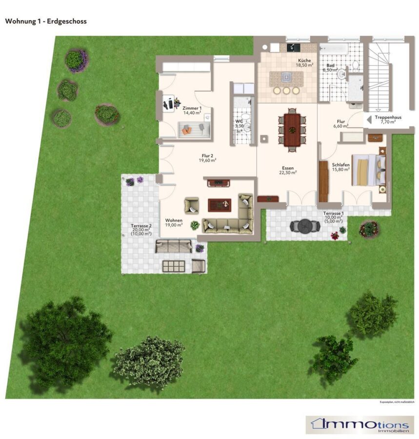Ein Highlight ist der ca. 449,8 m² große, eingefriedete Privatgarten mit zwei überdachten Süd-Terrassen, die den Wohnraum nach außen erweitern.