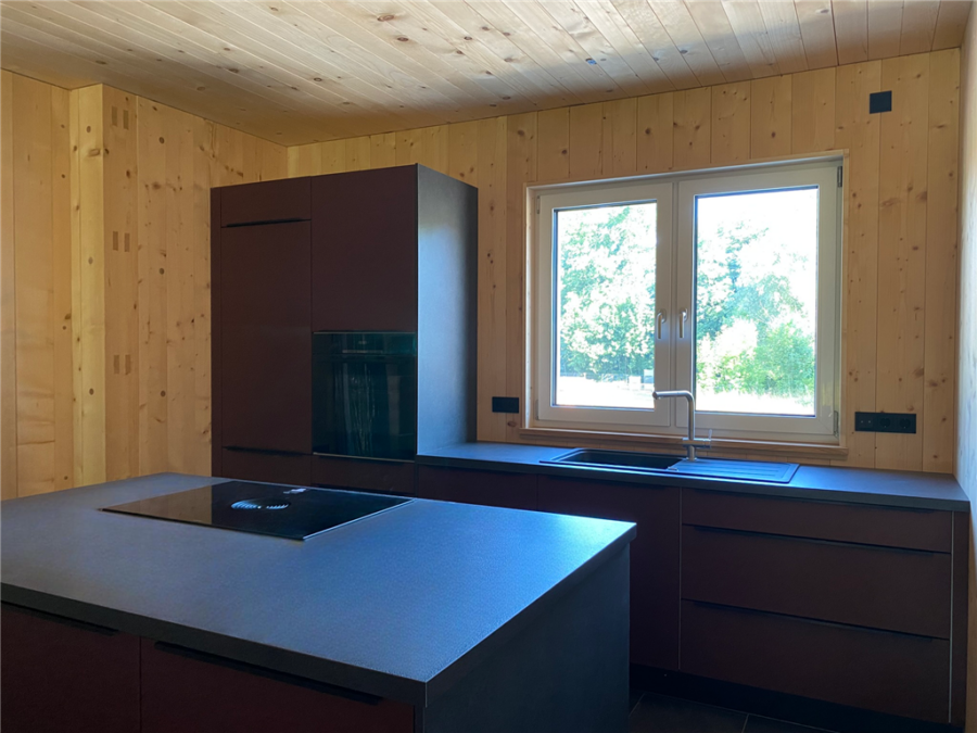 Der zentral gelegene Wohn-, Ess- und Kochbereich ist mit einer stilvollen Einbauküche ausgestattet: matte, dunkel weinrote Fronten, schwarze Stein-Arbeitsplatte, Kochinsel, Backofen, Kochfeld, Spülmaschine, Kühlschrank und Spüle.