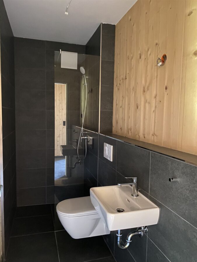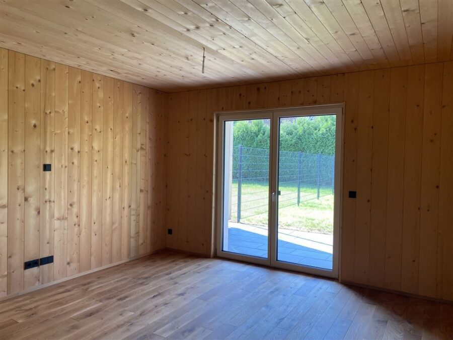 Die Ausstattung folgt einem hohen Qualitätsstandard: dreifach verglaste REHAU-Fenster, Holztüren, durchgehend verlegter Holzdielenboden sowie hochwertige Feinsteinzeugfliesen in Küche, Bädern und Eingangsbereich. Farblich abgestimmte Wand- und Bodenfliesen sowie schwarze Steckdosen runden das moderne Erscheinungsbild ab.